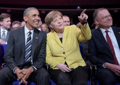 奧馬巴與默克爾在開(kāi)幕式上聆聽(tīng)展會(huì)方對(duì)本屆展會(huì)的介紹