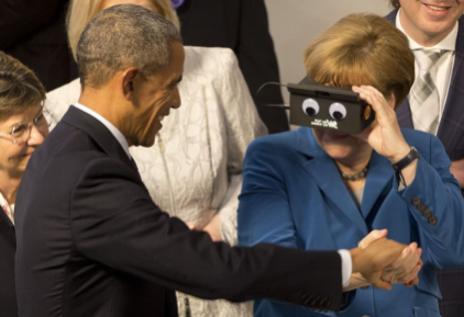 德國(guó)總理默克爾利用VR眼鏡與美國(guó)總統(tǒng)奧巴馬互動(dòng)